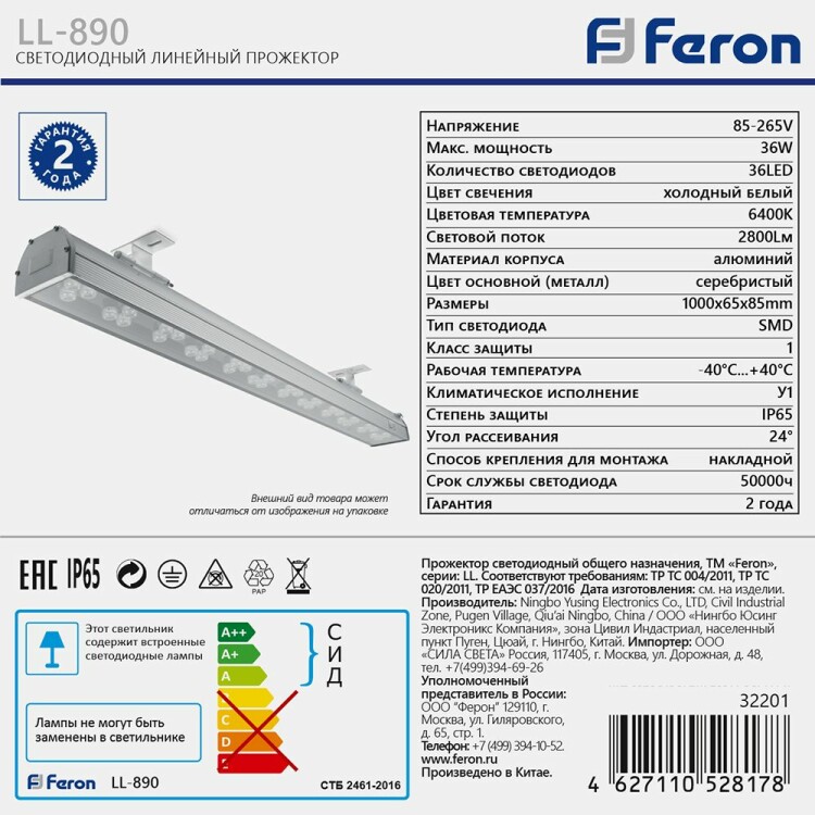 Линейный архитектурный светильник светодиодный, накладной (ДБУ) FERON LL-890, 36W, 6400К (холодный белый), 85-265V/50Гц, 2800Lm, IP65, угол рассеивания 24°, 36LED*SMD, класс защиты 1, раб.t -40°C...+40°C, цвет серебристый, корпус алюминий, 1000*65*85мм,
