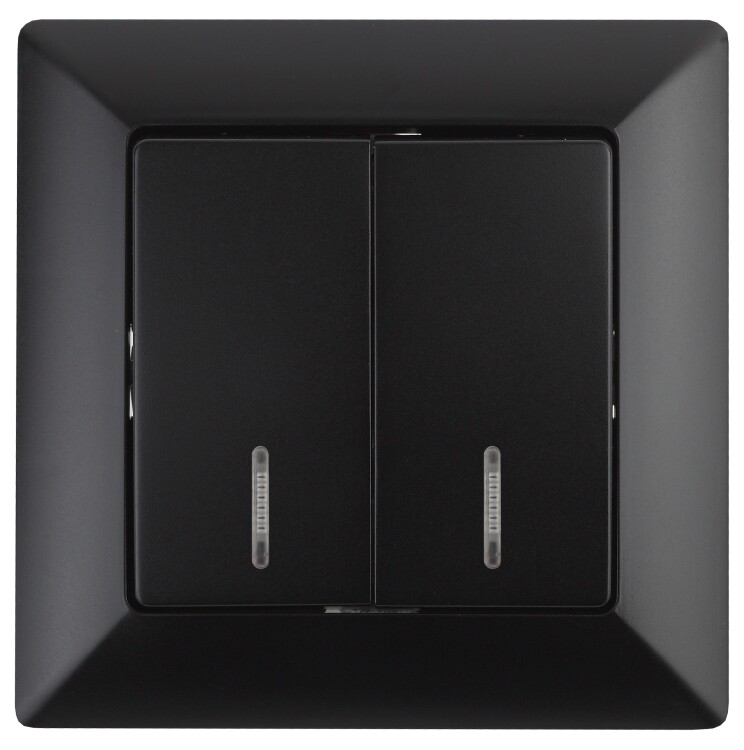 Выключатель 2-клавишный с подсветкой серии Intro Solo скрытой установки цвет антрацит 4-105-05. Номинальные характеристики 10А 250В . Выключатель выполнен из качественного негорючего термопласта, укомплектован одноместной рамкой, оснащён винтовыми клеммами. Вертикальное расположение клемм обеспечивает удобный и надёжный монтаж. Клеммы с двумя отверстиями позволяют соединять соседние выключатели шлейфом. Установка в подрозетник производится как на монтажные лапки, так и на винты. Для установки 2-х и более выключателей в несколько подрозетников в ряд дополнительно используются многоместные рамки: 2-х постовая - 4-502-хх, 3-х постовая 4-503-хх, 4-х постовая - 4-504-хх (где хх - цветовой код: 01 - белый, 02 - слоновая кость, 03 - алюминий, 04 - шампань, 05 - антрацит, 10 - венге, 11 - сосна).