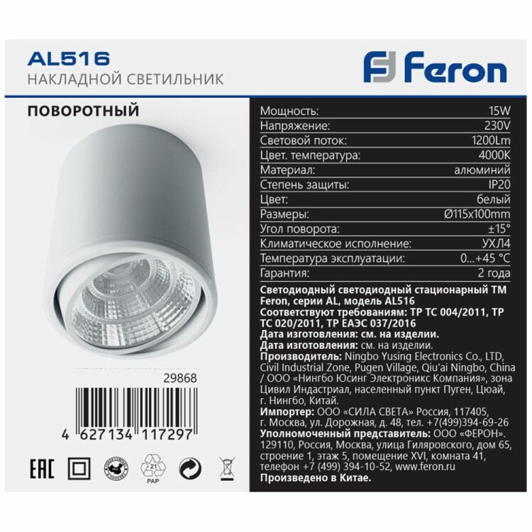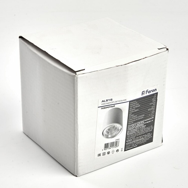 Светильник накладной светодиодный для акцентного освещения, спот поворотный (ДПО) FERON AL516, 15W, (белый), 230V, 1200Lm, IP20, угол рассеивания 30°, цвет белый, корпус алюминий, рассеиватель стекло, 115*115*100