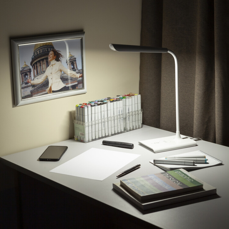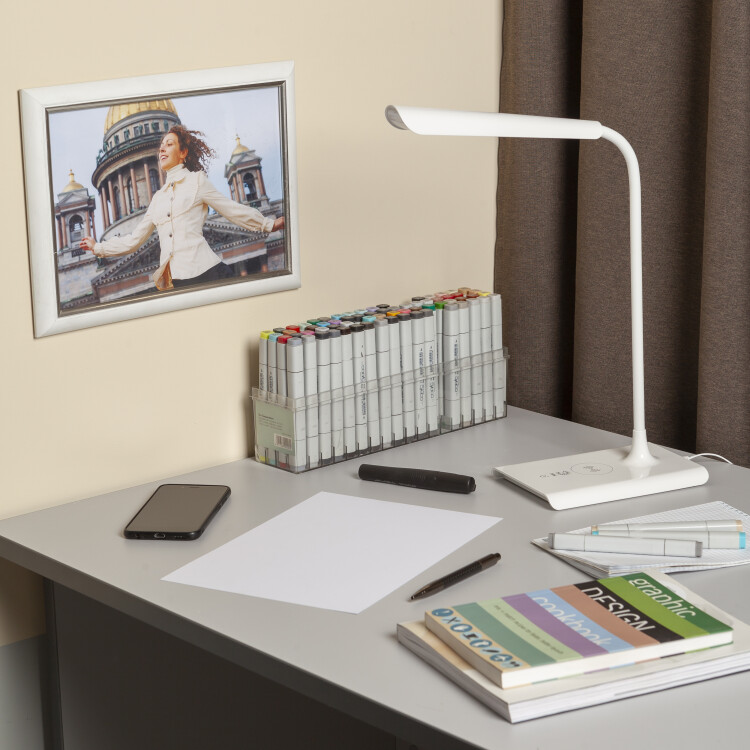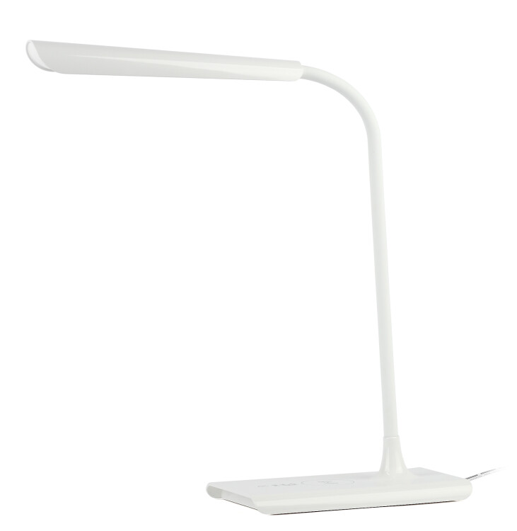 Настольный светильник ЭРА NLED-474-10W-W позволяет не только с комфортом читать или работать за столом, но и заряжать мобильные устройства от встроенного порта USB или беспроводным способом. Даже если такая функция не встроена в сам гаджет, в комплекте поставки 2 модуля, подключаемых к телефону для обеспечения функции беспроводной зарядки: с разъемом для iPhone (Lightning) и Android (микро-USB). Встроенный USB порт при желании позволяет заряжать, например, планшет или второй телефон одновременно с беспроводной зарядкой, это очень удобно. Управление светильником осуществляется при помощи сенсорных кнопок на основании, есть возможность плавной регулировки яркости. Корпус светильника глянцевый, а гибкая стойка покрыта приятным на ощупь материалом софт-тач.