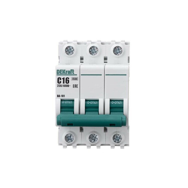 Автоматический выключатель серии ВА-101 Dekraft; 3P; номинальный ток 16 А; характеристика С; отключающая способность 4,5 кА. 5 монолитных заклепок повышают прочность корпуса аппарата. Сплошная лицевая панель обеспечивает безопасность эксплуатации аппарата. Боковые каналы охлаждения повышают стабильность работы при высоких температурах окружающей среды. Есть возможность установки дополнительных аксессуаров с левой стороны устройства. Аппарат на 100% совместим с корпусами Dekraft и Systeme Electric.