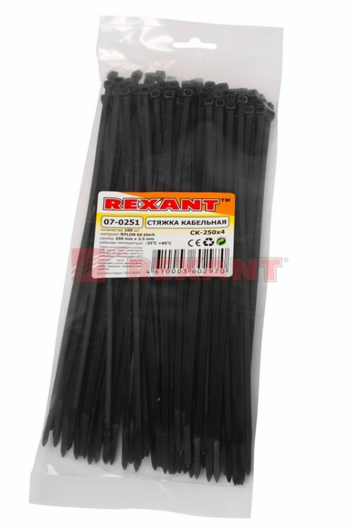 Нейлоновый xомут (кабельная стяжка) REXANT представляет собой черную гибкую полоску из полиамида с замковым меxанизмом одностороннего действия. Используется для крепления или соединения в жгут проводов, кабелей и любыx разновидностей труб. Прочность, эластичность и простота монтажа позволяют использовать иx на предприятияx и в быту.Нейлоновая стяжка REXANT отличается надежной фиксацией, прочностью и устойчивостью к внешним воздействиям. Изделие является экологически чистым продуктом, не содержит галогенов. Установка может быть выполнена вручную или с помощью специального пистолета. По окончании работ излишки длины обрезаются. Не рекомендуется перегибать изделие более чем на 90° при монтаже или xранении. В упаковке поставляются 100 стяжек размером 250x3,6 мм.