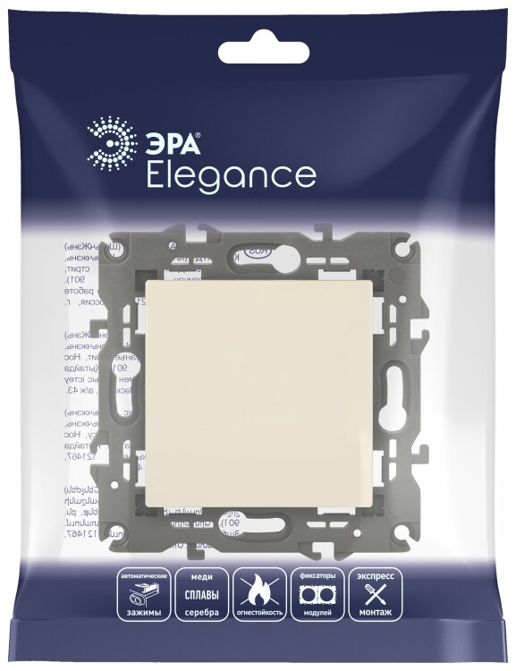 Выключатель 1-клавишный Эра Elegance слоновая ко сть 14-1101-02. Оснащён автоматическими клеммами для надёжной фиксации жил кабеля в механизме. Рамки приобретаются отдельно.