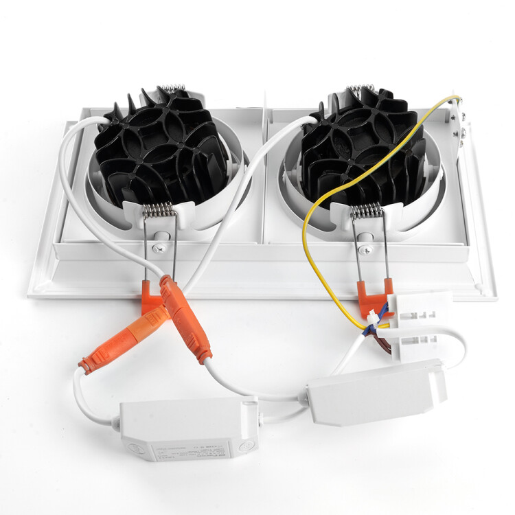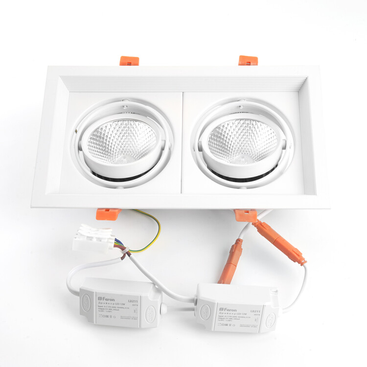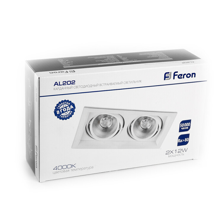 Светильник карданный встраиваемый светодиодный , карданный (ДВО) FERON AL202, 24W 4000К (белый), 170-265V, 2160Lm, IP20, угол рассеивания 35°, цвет белый, корпус алюминий, рассеиватель стекло, 260*145*73 мм, монтажн.отв. 240*125 мм.