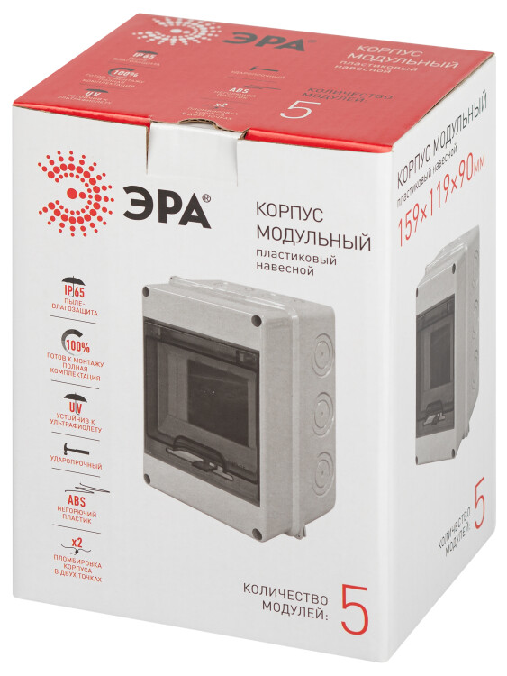 Корпуса модульные пластиковые серии КМПн IP65 ЭРА- предназначены для сборки распределительных щитов с использованием модульной аппаратуры, для ввода и распределения электрической энергии, а также защиты сетей напряжением до 400 В от токов перегрузки и короткого замыкания. Повышенная степень защиты корпуса позволяет использовать их в помещениях с большим содержанием пыли и влаги, например, в гаражах, производственных помещениях, подвалах, автомойках, на складах, а также на открытом воздухе. Преимущества корпусов : Изготовлены из пластика, не поддерживающего горение. Высокая технологичность и простой и быстрый монтаж. Высококачественный полиуретановый уплотнитель обеспечивает дополнительную защиту корпуса от влаги и пыли. Возможность опломбировки корпуса. Для защиты пыли и влаги использован принцип тоннельного уплотнения. Расширенный диапазон рабочих температур от -40°С до +75°С. Материал корпуса устойчив к воздействию ультрафиолета.