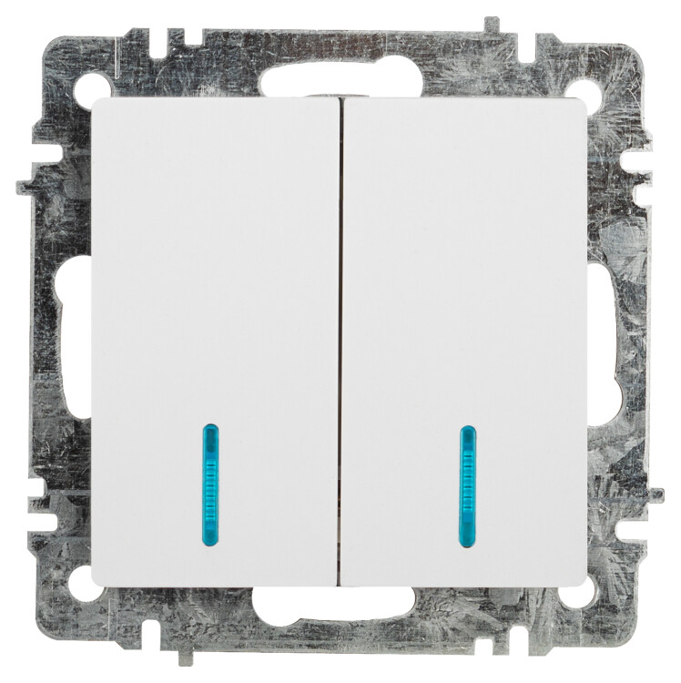 Выключатель 2-клавишный с подсветкой серии Intro Accent скрытой установки механизм цвет белый 6-105-01. Номинальные характеристики 10А 250В. Выполнен из негорючего термопласта, оснащён винтовыми клеммами. Парные клеммы обеспечивают соединение шлейфом. Монтаж в подрозетник производится и на лапки, и на винты. Рамка приобретается отдельно. В серии представлены рамки до 5 постов: на 1 пост - 6-501-хх, на 2 поста - 6-502-хх, на 3 поста - 6-503-хх, на 6 поста - 4-504-хх, на 5 постов - 6-505-хх (где хх - цветовой код: 01 - белый, 01М - матовый белый, 02 - слоновая кость, 03 - алюминий, 04 - шампань, 05 - антрацит, 06 - перламутр, 07 - графит, 08 - бронза, 09 - титан, 10 - венге, 11 - сосна)