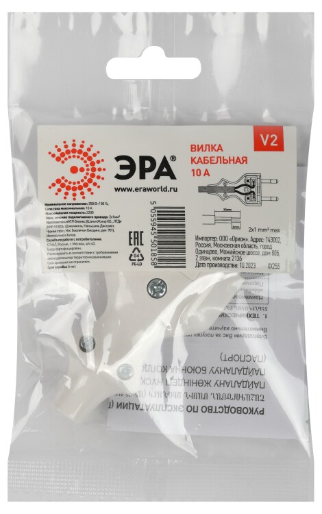 ЭРА Вилка V2 без заземления 10A прямой ввод белая