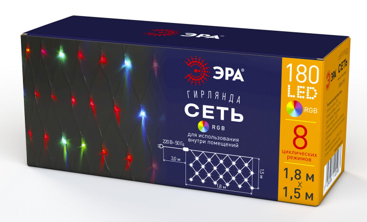 Новогодняя гирлянда ЭРА "Сеть" (арт. Б0041902) с разноцветными светодиодами. Гирлянда такого формата идеальна для украшения окон, подходит для декоративного оформления стен. Она формирует плотный световой рисунок, состоящий из 180 ярких источников света. Лёгкая сеть имеет оптимальные для дома, офиса или общественного пространства размеры: 1,8 м х 1,5 метра. Шнур длиной 3 метра даёт возможность использовать гирлянду на значительном расстоянии от розетки. Работает гирлянда от стандартной электросети 220 В без дополнительных переходников питания. Благодаря применению экономичной светодиодной технологии гирлянда ЭРА "Сеть" потребляет минимум электроэнергии, можно включать её в течение длинных новогодних праздников не боясь получить в итоге высокие счета. Сеть представляет собой совокупность ромбов, в местах сцепления которых светятся синие, красные, зелёные и оранжевые LED-элементы. Доступны 8 режимов свечения / мерцания / мигания. Создавайте праздничное настроение вместе с ЭРА.