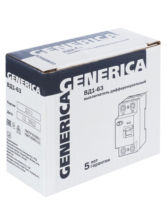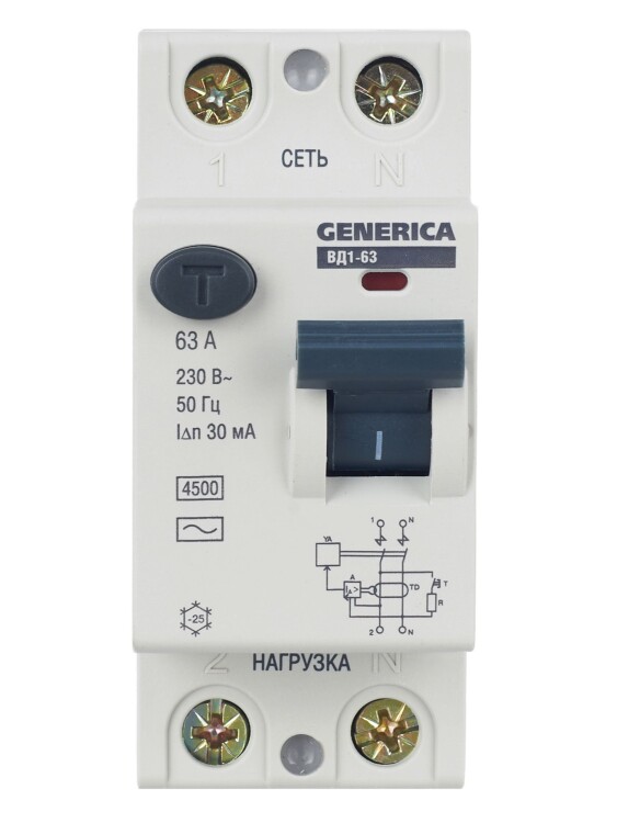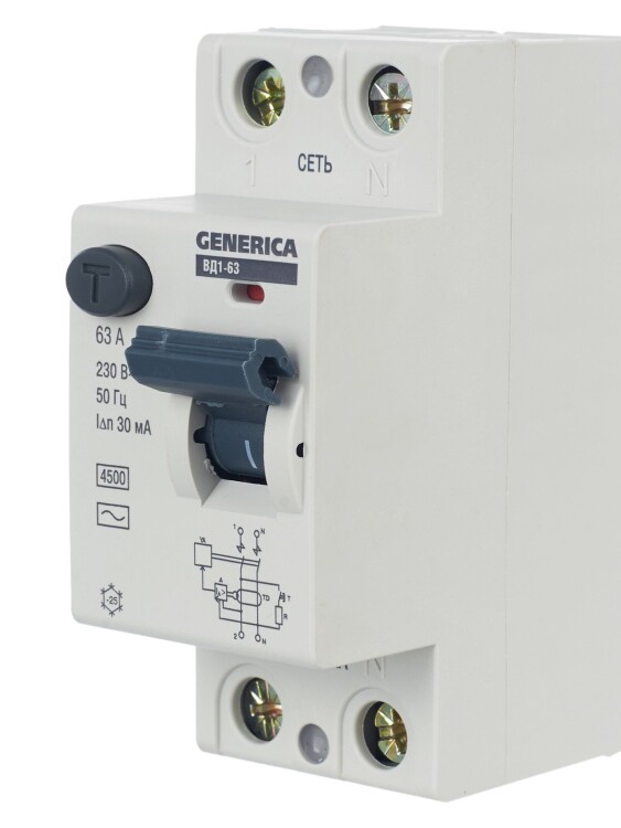 Быстродействующий защитный выключатель ВД1-63 (УЗО) GENERICA - устройство электронного типа, зависящее от напряжения и реагирующее на дифференциальный ток, без встроенной защиты от сверхтоков. Предназначен для защиты человека от поражения электрическим током.