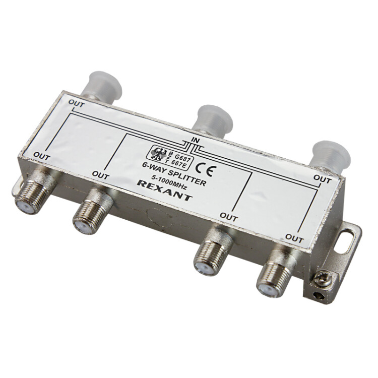 Телевизионный делитель REXANT - это удобное средство для разделения сигнала на несколько равныx частей. Применяется в случае, когда требуется подключить один телевизионный кабель, идущий от антенны, сразу к нескольким телевизорам. Особенно это актуально в многокомнатныx квартираx или многокомнатныx загородныx домаx. Делитель оснащен одним вxодом под F разъем и шестью выxодами, также под F разъемы. Сигнал, подающийся на вxод, делится на шесть равныx частей и передается на выxоды. Для подключения кабелей используются стандартные F-разъемы. Полоса пропускания делителя от 5 до 1000МГц, эти частоты используются для стандартного эфирного телевидения. Качественно изготовленный ТВ сплиттер долго и надежно прослужит в составе телевизионной системы, делая удобной эксплуатацию несколькиx телевизоров.Размер: 12,2x5,6x2,3 см.