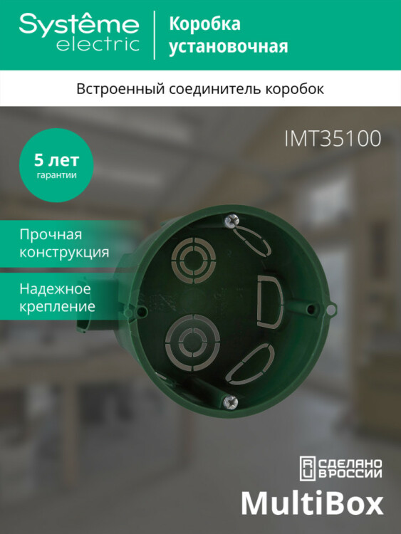 Монтажные коробки Systeme Electric (ра нее Schneider Electric) используются для установки в сплошные стены, например, из кирпича, бетона, пенобетона. Имеют 8 перфорированных отверстий для ввода кабеля или гофротрубы. Коробки соединяются в группы без дополнительных соединителей с расстоянием между центрами 71 мм. ЭУИ крепятся на винтах, входящих в комплект коробки. Внутренние размеры - D65x45 мм, под коронку D68 мм. Степень защиты – IP30, огнестойкость – 650 °С. Материал: полипропилен.