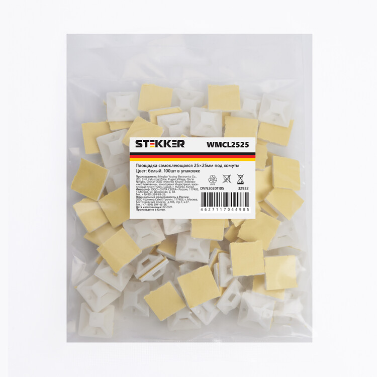 Площадка под хомут STEKKER WMCL2525 самоклеющаяся, цвет белый, размер 25*25мм., материал: нейлон . Максимальный размер хомута: 4,7мм., 100 шт в упаковке.