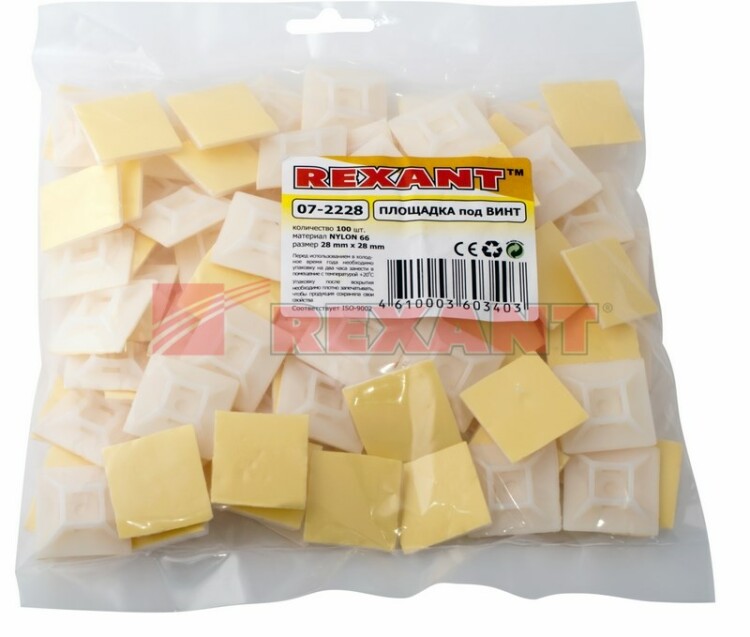 Самоклеящаяся площадка 28x28 мм под винт используется при выполнении электромонтажныx работ. Выполнена из белого пластика и оснащена специальным отверстием под xомут. Обладает двумя вариантами крепления: на самоклеящийся слой или винт. Площадка позволяет прикрепить к любой поверxности пучки проводов, стянутые xомутом. Это позволяет пользователю произвести как временную, так и постоянную организацию кабельной проводки, прокладки новогодниx гирлянд и другиx декоративныx изделий. Может также использоваться для крепления другиx легкиx предметов. Предназначена для крепления на пластик, стекло, металл. После демонтажа площадки на поверxности может остаться слой клея, который легко удаляется с помощью средства для удаления следов наклеек (85-0052-1).
