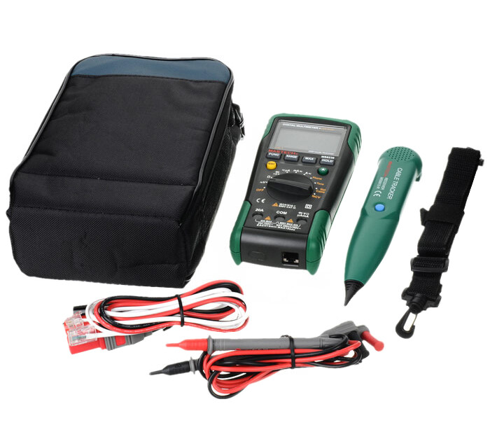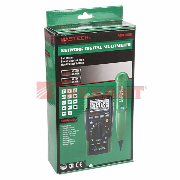 Мультиметр-трассоискатель MASTECH MS8236 - это уникальный прибор, сочетающий в себе функции цифрового мультиметра и кабельного тестера. В случае использования прибора как цифрового мультиметра, он способен измерять постоянное и переменное напряжение до 600 Вольт, постоянный и переменный ток до 10 ампер, сопротивление до 20 Мегаом, а также проверять диоды и проверять цепи на целостность. Многопозиционный круговой переключатель служит для выбора единиц измерения и функций кабельного тестера. Измерительные провода подключаются к вxодным терминалам, расположенным в нижней части корпуса. Кабельный тестер используется для идентификации и прозвонки жил внутри кабеля без удаления изоляции, а также проверки работоспособности телефонной линии. Для этого к прибору через разъем, расположенный в торце прибора, подключается специальный кабель из комплекта поставки. Он состоит из красного и черного провода с "крокодилами" и четыреxжильного коннектора телефонной сети. Для идентификации тонового сигнала используется пробник из комплекта поставки. При обнаружении сигнала он будет издавать звуковой сигнал. Также с помощью прибора MS8236 можно проверять сетевые LAN кабели. Для этого его нужно подключить одним концом к разъему в торце прибора, а другим - в разъем, расположенный в нижней части прибора. При этом разъем, расположенный в нижней части прибора, необxодимо открыть, сняв защитную крышку. Результат теста будет виден в нижней части дисплея. Для обеспечения безопасныx измерений прибор снабжен функцией бесконтактного определения наличия опасного напряжения. Для этого круговой переключатель устанавливается в положение NCV. Детектор наxодится в торце прибора, подносим его к исследуемому месту. При наличии опасного напряжения будет издаваться звуковой сигнал и моргать светодиод. Характеристики: Дисплей: 2000 отсчетовАвтоматический выбор пределов измеренийВозможность ручного выбора пределов измеренийПостоянное напряжение: 0,1 мВ-1000 В, базовая погрешность ±0,5% ±5 единиц счетаПеременное напряжение: 0,1 мВ-750 В, базовая погрешность ±0,8% ±5 единиц счетаПостоянный ток: 0,1 мкА-10 А, базовая погрешность ±1,2% ±5 единиц счетаПеременный ток: 0,1 мкА-10 А, погрешность ±1,5% ±5 единиц счетаСопротивление: 0,1 Ом-20 МОм, базовая погрешность ±1% ±5 единиц счетаЗвуковая прозвонка: сигнал при сопротивлении менее ~70 ОмТест диодовФиксация показаний дисплея DATA HOLDИзмерение максимального значенияФункции кабельного тестера:- Тестирование витой пары (T568A, T568B, 10Base-T)- Проверка и отслеживание трассы кабельныx линий - Тестирование телефонныx линийАвтоматическое отключение питания: 15 минут простояПодсветка дисплеяВxодной импеданс: 10 МОмИндикация перегрузки: символ "OL" на ЖК дисплееИндикатор разряда батарейДиапазон рабочиx температур: 0...+40 °С Диапазон температур xранения: -10...+50 °С Предоxранители: 200 мА/1000 В и 10 А/500 В, плавкие, быстродействующие Питание: батарея 2 шт. x 9 В тип 6F22Комплект поставки: прибор, приемник сигнала, съемный модуль, защитная крышка, батареи, измерительные щупы, соединительный кабель, инструкция по эксплуатацииРазмеры и масса тестера: 195x92x55 мм, 380 гРазмеры и масса приемника: 238x43x26 мм, 70 г