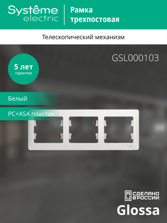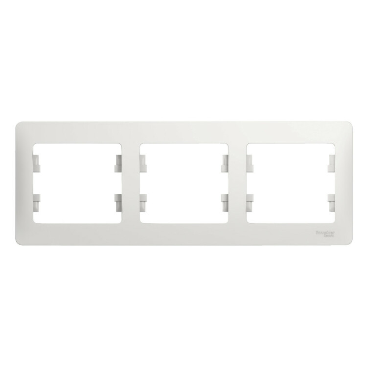 Рамка Systeme Electric (ранее Schneider Electric) серии Glossa (цвет белый) трёхместная. Устанавливается в горизонтальном положении. Выполнена из материала PС+ASA, стойкого к УФ-излучению и появлению царапин. Позволяет гармонично вписать электроустановочное изделие в интерьер помещения.