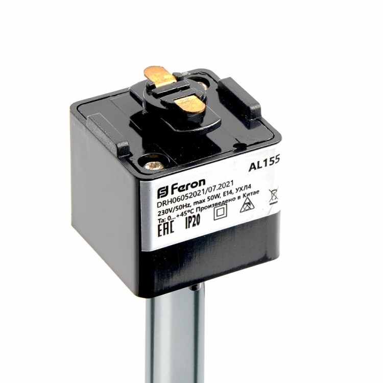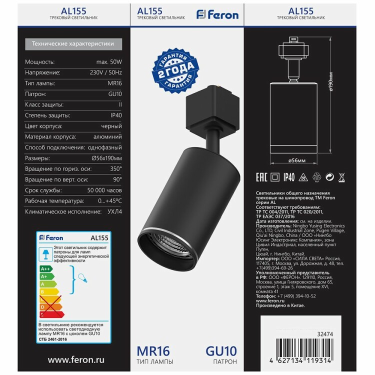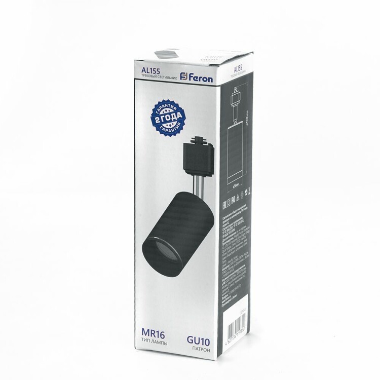 Светильники трековые на шинопровод GU10, однофазный (ИВО) FERON AL155, 50W, 230V, цвет черный, корпус алюминий, вращение →350°/↓90°, 56*56*190 мм