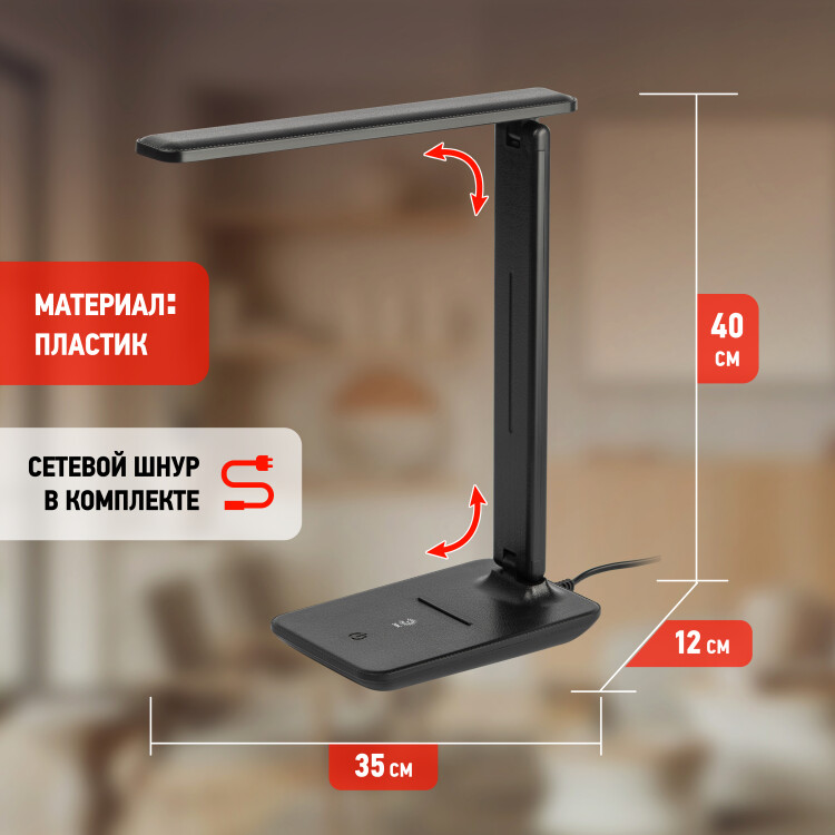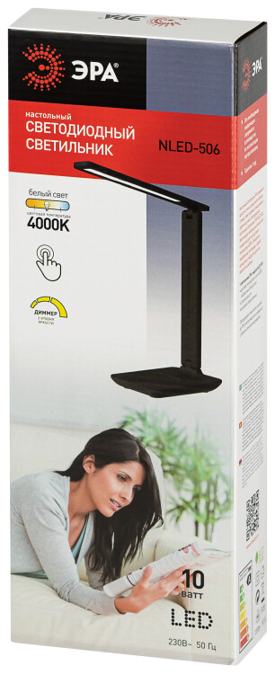Настольный светильник ЭРА NLED-506-10W-BK со светодиодами (LED) в качестве источников света в дизайне "под кожу" ,с выключателем на основании. Светильник оснащен сенсорным управлением, светит нейтральным белым светом с возможностью регулировки яркости. Направление света регулируется поворотом панели со светодиодами относительно стойки для максимального комфорта. Складная конструкция для оптимального хранения.