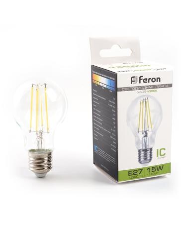 Лампа светодиодная филамент FERON LB-615, A60 (шар), 15W 230V E27 4000К (белый), рассеиватель прозрачный 1350Lm, угол рассеивания 270°, 107*60мм