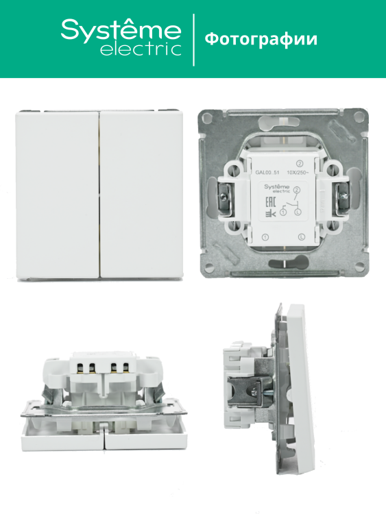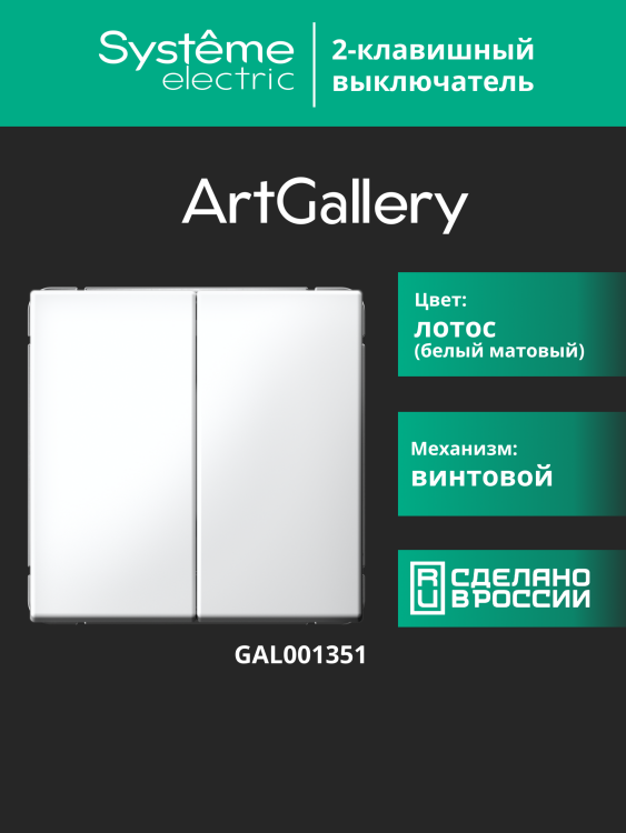 Механизм выключателя 2-клавиш ного Systeme Electric серии ArtGallery в цвете лотос подходит для сетей 250 В, на ток 10 А.