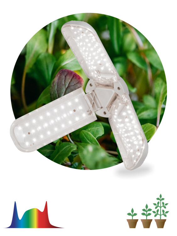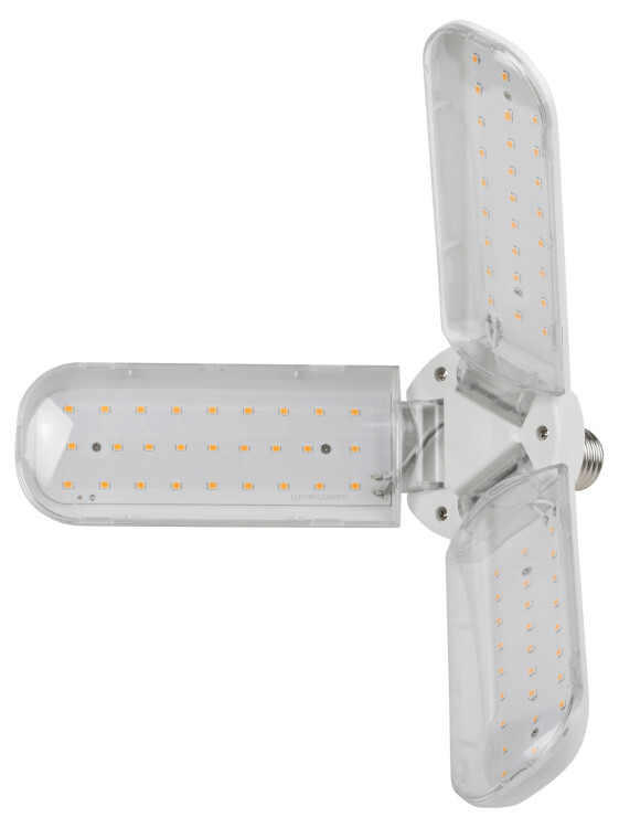 Эта удобная бытовая фитолампа-трансформер полного спектра по своей мощности и эффективности не уступает профессиональному фитопрожектору. Обеспечивает качественную досветку 2 кв м рассады. Мягкий белый свет комфортен для глаз человека. Поворотные лепестки позволяют быстро и без усилий изменить направление и интенсивность освещения конкретных растений. Эффектный внешний вид и максимальный комфорт в применении. На каждом лепестке по 27 светодиодов. Каждый лепесток поворачивается на 180 градусов. Индивидуальное регулирование наклона и направления светодиодных лепестков даёт возможность создать множество уникальных сценариев подсветки растений.