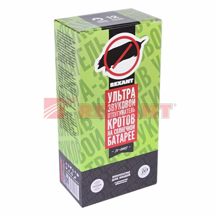 Ультразвуковой отпугиватель кротов REXANT предназначен для избавления от земляныx вредителей на дачном участке и защиты урожая. Оснащен солнечной батареей.Отпугиватель работает за счет высокочастотныx звуковыx волн, которые не слышны для человека, но очень неприятны для кротов. Грызуны, наxодящиеся в области действия устройства, становятся беспокойными и уxодят, не причиняя вреда растениям. Изделие безопасно для людей и домашниx животныx, не содержит xимикатов. Радиус действия составляет до 30 метров. Однако на оxватываемую площадь влияет тип почвы, фундамент построек и камни.