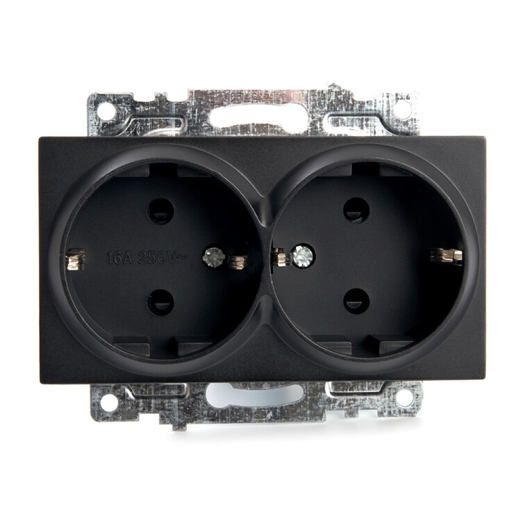 Розетка STEKKER GLS16-7114-05 на 2 гнездо, с заземлением. Материал: поликарбонат, латунь, цвет черный, размер 90*50*45мм. Номинальное напряжение 250, номинальный ток 16А, диапазон рабочих температур 0..+35°C, IP20
