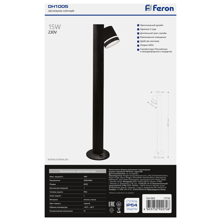 Светильник садово-парковый, серии «Рио», (НТУ) FERON DH1005 15W, GX53, 230V, IP54, цвет черный, цилиндр, столб, 155*85*600мм