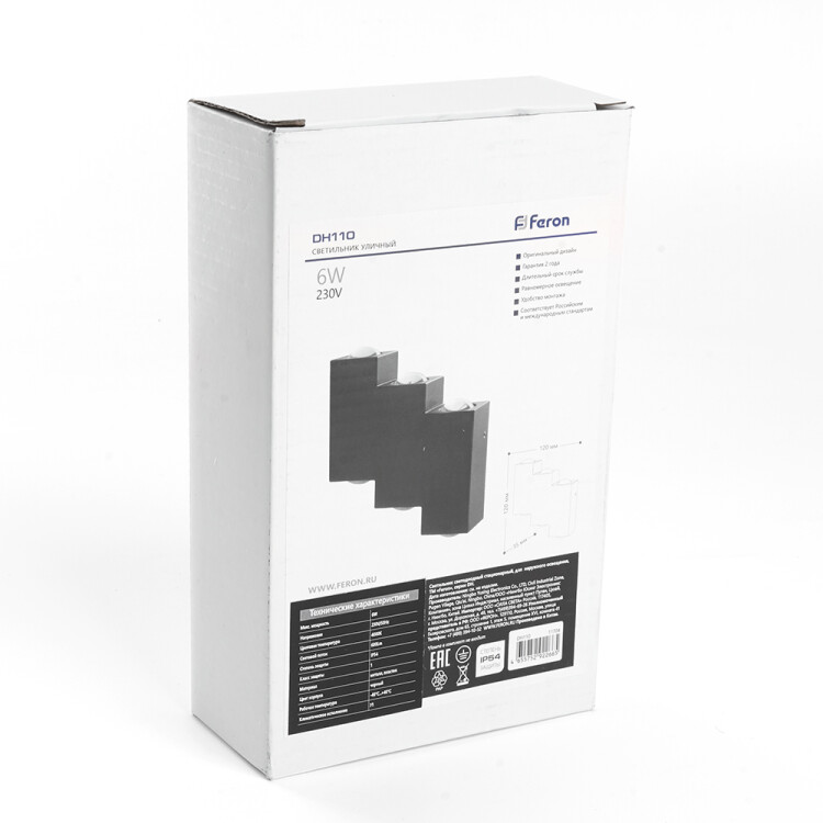 Светильник уличный светодиодный, на стену (ДБУ) FERON DH110, серия Нью-Йорк, 6W, 4000К (белый натуральный), 230V/50Гц, 600Lm, IP54, 6LED*SMD3030, класс защиты 1, раб.t -40°C...+40°C, цвет черный, корпус алюминий, 120*35*120мм,