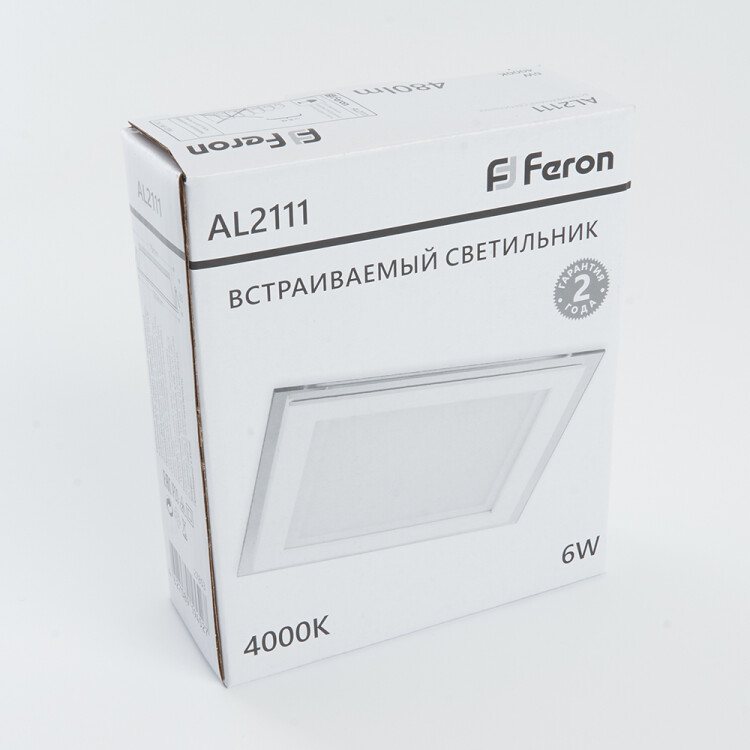 Светильник встраиваемый светодиодный, декоративный (ДВО) FERON AL2111, 6W 4000К (белый), 175-265V, 480Lm, IP20, угол рассеивания 110°, цвет белый, корпус алюминий, стекло, рассеиватель матовый акриловый полимер, 100*100*33 мм, монтажн.отв. 75*75 мм.