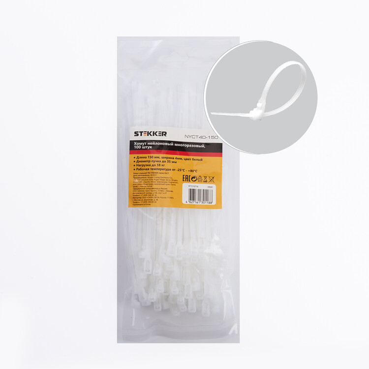 Хомут электромонтажный STEKKER NYCT40-150, Да, белый, материал - нейлон , максимальный диаметр пучка - 35мм, нагрузка - 18кг, диапазон рабочих температур -25°C - +80°C, рекомендуемая температура хранениня +5°C - +25°C
