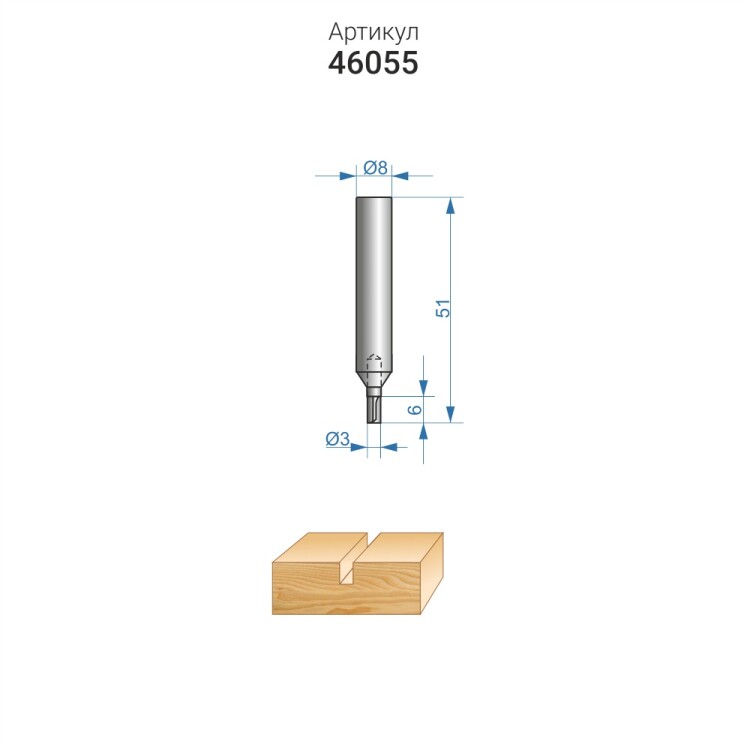 Диаметр фрезы D: 3 мм, Диаметр хвостовика d: 8 мм, Рабочая высота Н: 6 мм, Общая высота L: 51 мм
