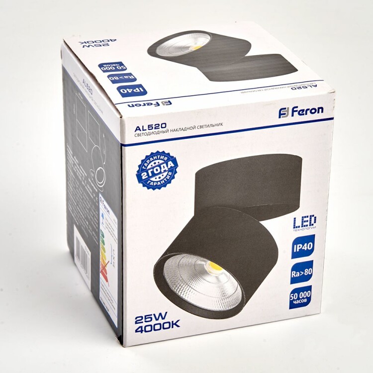 Светильник накладной светодиодный для акцентного освещения, спот поворотный (ДПО) FERON AL520, 25W, 4000К (белый), 170-265V, 2250Lm, IP40, угол рассеивания 90°, цвет черный, корпус алюминий, рассеиватель стекло, 103*103*145