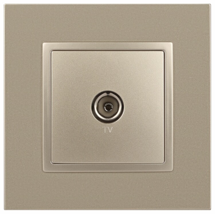 Розетка телевизионная одиночная серии Эра Elegance цвет шампань 14-3101-04. Рамки приобретаются отдельно. Рамки Эра Elegance ПЛАСТИК: 1 пост 14-5001-хх, 2 поста 14-5002-хх, 3 поста 14-5003-хх, 4 поста 14-5004-хх, 5 постов 14-5005-хх; СТЕКЛО: 1 пост 14-5101-хх, 2 поста 14-5102-хх, 3 поста 14-5103-хх, 4 поста 14-5104-хх; МЕТАЛЛ: 1 пост 14-5201-хх, 2 поста 14-5202-хх, 3 поста 14-5203-хх, 4 поста 14-5204-хх; ДЕРЕВО: 1 пост 14-5301-хх, 2 поста 14-5302-хх, 3 поста 14-5303-хх, 4 поста 14-5304-хх (хх - код цвета: 00-прозрачный, 01-белый, белёный дуб, 02-слоновая кость, 03-алюминий, 04-шампань, 05-чёрный, чёрное дерево, 07-ясень, 09-дуб, 10-венге, 11-клён, 14-медь, 21-жёлтый, 22-оранжевый, 23-красный, 25-бордо, 26-лайм, 27-зелёный, 28-голубой, 29-синий, 30-розовый, 31-мокко, 32-серый, 41-сталь, 42-титан).