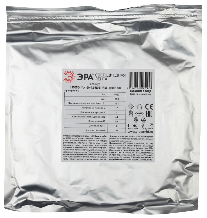 ЭРА Лента светодиодная LS5050-14,4-60-12-RGB-IP65-2year-5m (70/2100) со степенью защиты от пыли и влаги IP65 - современный способ создания внутреннего освещения, подсветки ниш, лестничного пространства, систем хранения, а также декоративного и художественного оформления любых объектов и форм в помещениях с повышенным уровнем влажности и уличного освещения. Легко и быстро устанавливается на любой гладкой поверхности с помощью скотча, расположенного на оборотной стороне ленты. Используя алюминиевый профиль, можно создавать необычные и функциональные решения освещения в Вашем интерьере. Рабочее напряжение ленты составляет 12В, а мощность равна 14,4 Вт/м. Светодиодная лента обладает световым потоком , и цветом свечения - многоцветный (620/520/465 Нм)