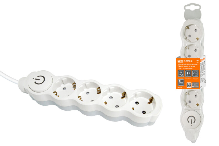 TDM Удлинитель бытовой "Люкс" УЛ04В выкл, 4 гнезда, 10м, с/з, с з/ш, ПВС 3х1мм2 16А/250В бело-серый.