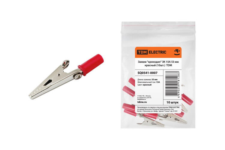 TDM Зажим "крокодил" ЗК 15А 53мм красный (10шт).