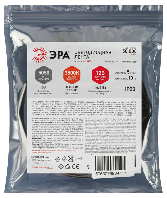 Светодиодная лента ЭРА LS5050-14,4-60-12-3500K-IP20-1 year-5m теплый белый свет, 5м со степенью защиты от пыли и влаги IP20 - современный способ создания внутреннего освещения, подсветки ниш, лестничного пространства, систем хранения, а также декоративного и художественного оформления любых объектов и форм в помещениях. Легко и быстро устанавливается на любой гладкой поверхности с помощью скотча, расположенного на оборотной стороне ленты. Используя алюминиевый профиль, можно создавать необычные и функциональные решения освещения в Вашем интерьере. Рабочее напряжение ленты составляет 12В, а мощность равна 14,4 Вт/м. Светодиодная лента обладает световым потоком 750 Лм/м, и цветом свечения - теплый белый (3500 К)