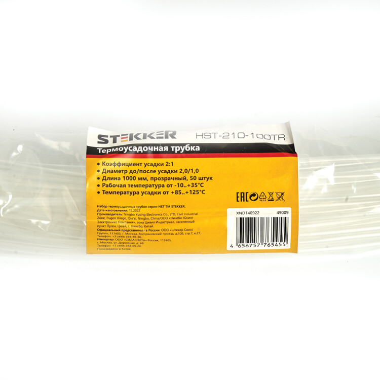 Термоусадочные трубки STEKKER HST-210-100TR, длина 1000мм. 50шт. в наборе, цвет: прозрачный. Коэффициент усадки 2:1, диапазон рабочих температур -10..+35°C, температура усадки +85..+125°C, номинальный ток 32А, для проводов сечением мм2.