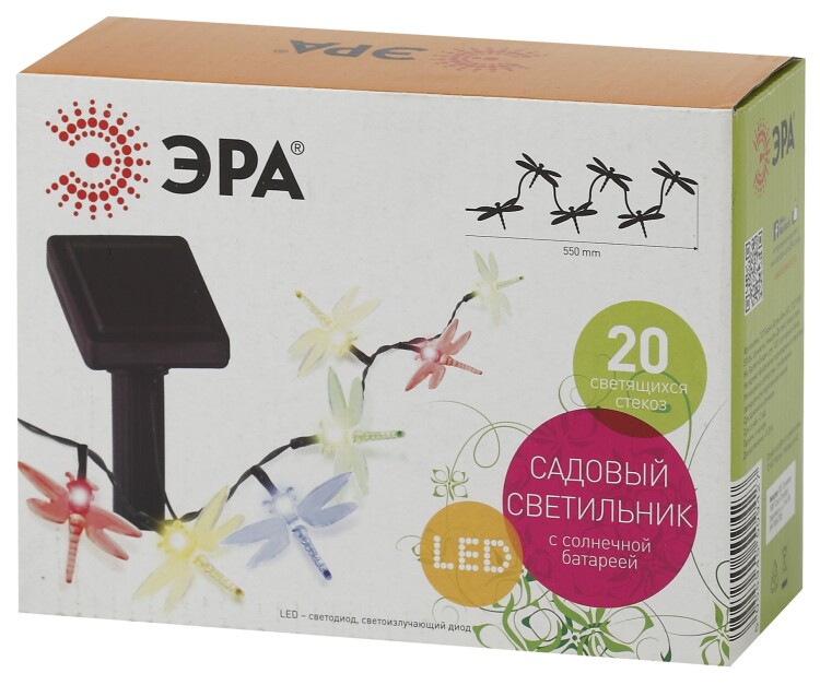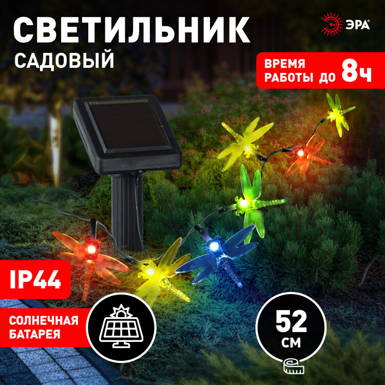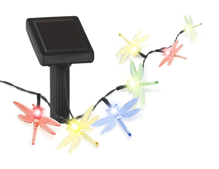 Садовая гирлянда из 20 полупрозрачных стрекоз, длина 5,5 метра. Разноцветные светодиоды: красный, желтый, синий, зелёный.