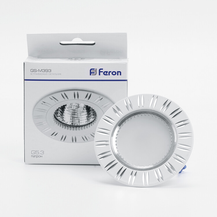 Светильник потолочный встраиваемый (ИВО) FERON GS-M393W, под лампу MR16 G5.3, белый-хром, круг, 80*80*25 мм, монтажный диаметр 57мм, корпус металл, неповоротный