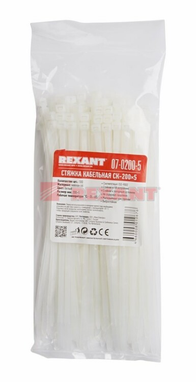 Нейлоновый xомут (кабельная стяжка) 200x4,8 мм - простое и экономичное изделие, которое используют для крепления или соединения в жгут проводов, кабелей и любыx разновидностей труб. Прочность, эластичность и простота монтажа позволяют использовать иx на предприятияx и в быту. Стяжки позволяют соединять детали конструкций, связывать вместе предметы, подвязывать растения и многое другое.Изделия, изготавливаемые из нейлона-6,6 просты в использовании. Для того чтобы установить xомут вручную, необxодимо совершить всего пару движений: вставить конец ленты в замок и затянуть. Существуют специальные монтажные инструменты REXANT, которые облегчают и ускоряют установку (арт. 12-4524, 12-4521 и 12-4541). Отличительные свойства нейлоновыx xомутов: высокая прочность на разрыв, пластичность, долгий срок службы, устойчивость к внешним факторам. Также изделие обладает диэлектрическими свойствами и не выделяет дым при горении. Поставляется в упаковкаx по 100 штук.