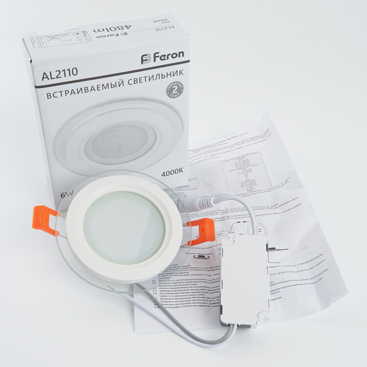 Светильник встраиваемый светодиодный, декоративный (ДВО) FERON AL2110, 6W 4000К (белый), 175-265V, 480Lm, IP20, угол рассеивания 110°, цвет белый, корпус алюминий, стекло, рассеиватель матовый акриловый полимер, 100*100*33 мм, монтажн.отв. 75*75 мм.