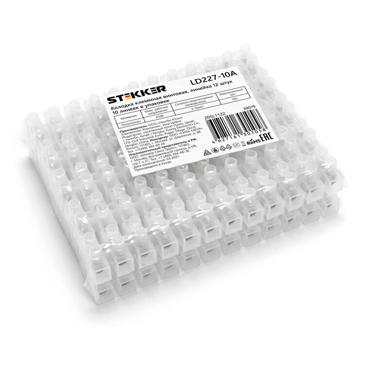 Клемма винтовая колодка STEKKER LD227-10A, 12-проводная 6- 10мм2, 450В, 10А, без пасты, материал изделия Полиэтилен. Тип провода одножильный/многожильный, материал провода латунь/медь, температура окружающей среды -25°C ..+80°C