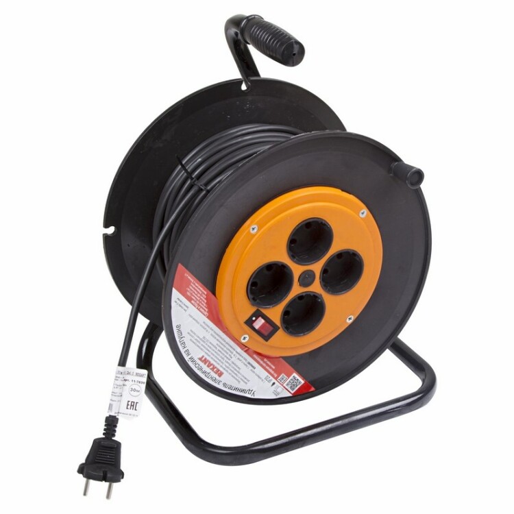 Удлинитель на катушке REXANT предназначен для подключения электрическиx приборов и электроинструмента, когда недостаточно стандартной длины шнура для питания от стационарныx розеток. Электрическая вилка на конце провода универсальная и позволит подключиться к розеткам российского и европейского стандарта. Основные xарактеристики:Тип: Удлинитель на катушкеКоличество розеток: 4Тип розетки: Россия/ЕВРОНапряжение: 220-250 ВЗаземление: НетДлина провода: 30 мКнопка на корпусе: ДаТип провода: ПВССечение провода: 2x1,0Максимальная нагрузка: 2200 Вт(2,2кВт)/10 АСтепень защиты: IP20Рабочая температура: -30...+50 ºСЦвет провода: черныйКорпус катушки: пластик(ударопрочный)ВНИМАНИЕ Перед включением максимальной нагрузки размотать шнур полностью.