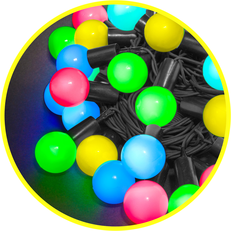 тип гирлянды - шарики ; диаметр шарика - 2,4 см; цвет свечения - разноцветное RGB; режим свечения - мерцание; общая длина - 11,5 м; длина провода до первого светодиода - 1,5 м; количество светодиодов - 70 шт; расстояние между шариками - 10 см; соединение в линию до 3х гирлянд; тип провода - черный каучук; степень защиты - IP44; температура эксплуатации от -40 до +40°С; срок службы - 50000 часов; гарантия - 12 месяцев.