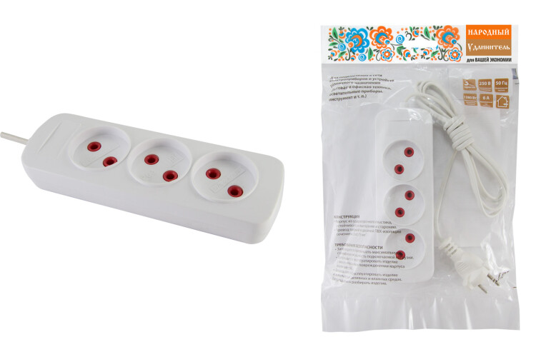 TDM Удлинитель 3 гнезда, 1,5 метра, б/з, 6 А, 1380 Вт, белый, НАРОДНЫЙ У-31011