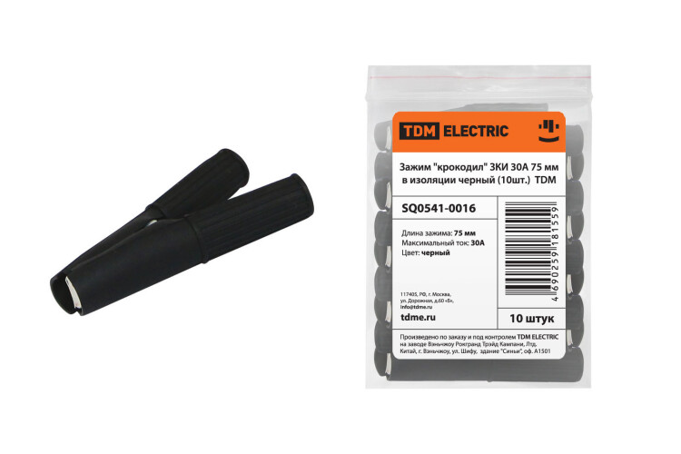 TDM Зажим "крокодил" ЗКИ 30А 75мм в изоляции черный (10шт).
