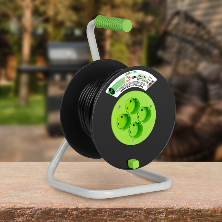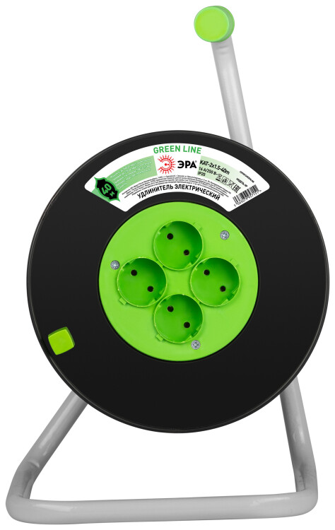 Удлинитель силовой ЭРА GREEN LINE на пластиковой катушке KAT-2x1.5-40m, 4 розетки без заземления. Провод ПВС 2х1,5мм2, 40м. Мощность 16А/3500Вт. Используется для работы на строительных площадках или дачных участках. Удобен при работе с приборами, находящимися удаленно от стационарной розетки. Например, газонокосилки, электрические, пилы, триммеры или электродрели. Рама катушки сделана из высокопрочной стали, а пластиковой корпус катушки выполнен с применением негорючих добавок.
