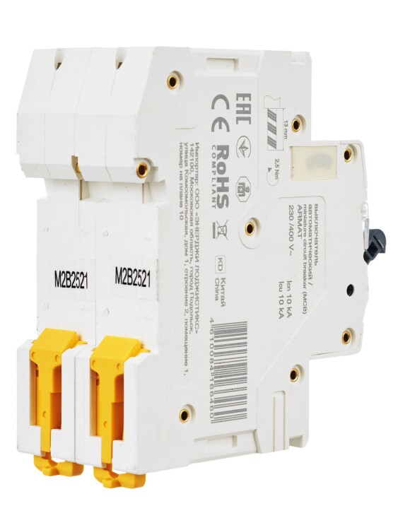 Автоматические выключатели ARMAT серии M10N предназначены для защиты цепей от перегрузки и короткого замыкания. Модельный ряд включает в себя устройства с характеристиками срабатывания B, C, D и номинальными токами от 0,5 до 63 А. Номинальная отключающая способность автоматических выключателей ARMAT серии M10N составляет 10 кА. Предельная отключающая способность варьируется в зависимости от номинала от 10 до 50 кА.
