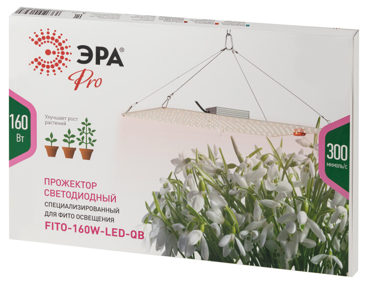 ЭРА FITO-160W-LED-QB - это полный комплект для организации фитоосвещения: светодиодная панель Quantum Board, надёжный металлический блок питания (выключатель на проводе, вилка), карабин с узлом регулировки высоты подвеса (до 2 метров), карабин с тросовым креплением.